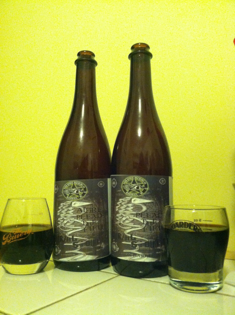 S: The 2010 bbpt5 is really muted and has a light char, some faded cocoa like chocolate milk left out overnight, the bourbon profile imparts more of a coconut and oaky ghost rather than the full on fisting that the fresh version pumps in 5 digits strong. The aigre is a totally different beast. I was expecting some Tart of Darkness fucking sour stout, but the sour profile is really nuanced and makes me doubt whether they really set out to make this sour. There is a cola/Dr. Pepper aspect with some black cherry and currant, but again, its really in the backfield kicking grass and not really contributing much to the company softball team. It is essentially pleading the 5th on the sour olfactory notes.